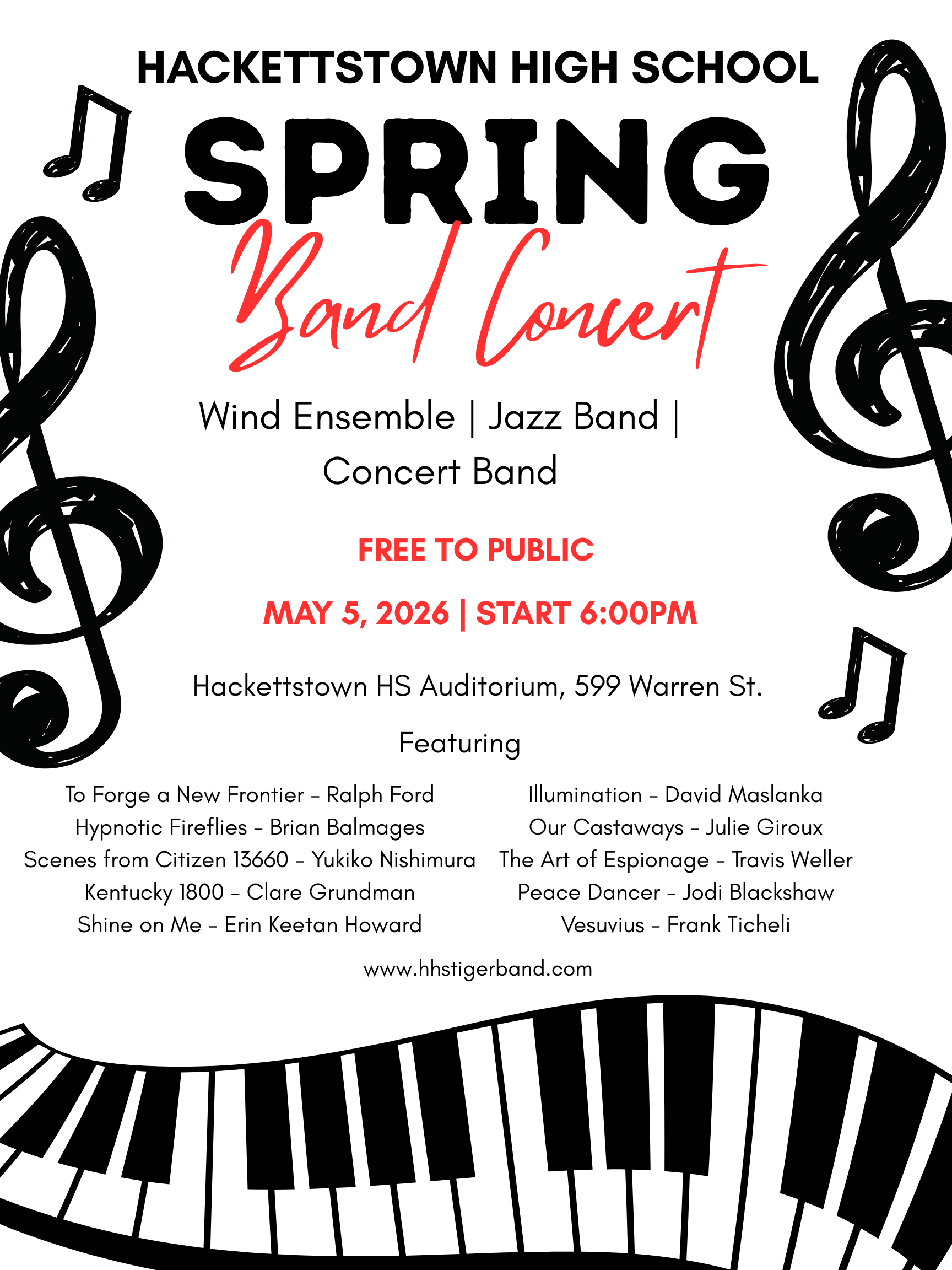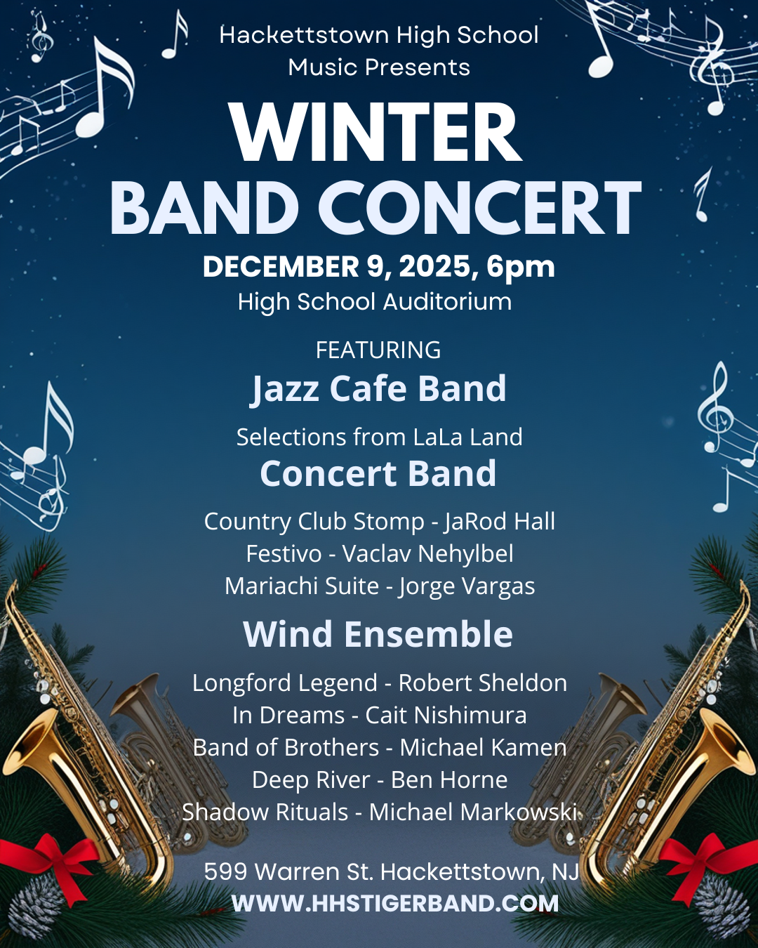 The Hackettstown High School bands have a successfully storied history. The Tiger Marching Band is a 4-time medalist at USBands State Championships and were recently crowned the 2025 USBands Group 2a Champions. We are also bronze (2022), silver (2023), and gold (2024) medal winners at USBands National Championships. The Wind Ensemble holds 3 gold ratings and multiple silver ratings in the NJSMA Region 1 Concert Band Festival. Our ensembles have worked with prominent musicians such as Dr. Jason Noble of Columbia University, Dr. Payton McDonald of WPU (NJ), Dr. Westgate of UMass, Dr. Tom McCauley of MSU (NJ), professional tubist Jarrod Briley, and composers Peter Sciaino and Chris Bernotas. The bands at Hackettstown have performed in Boston, Norfolk, Cleveland and Annapolis. In 2014, the Hackettstown Band was in the Super Bowl Halftime show featuring Bruno Mars. In 2024, the band commissioned a new work by composer Grace Baugher Dunlap titled Vicious Cycles which is available through Murphy Music Press.